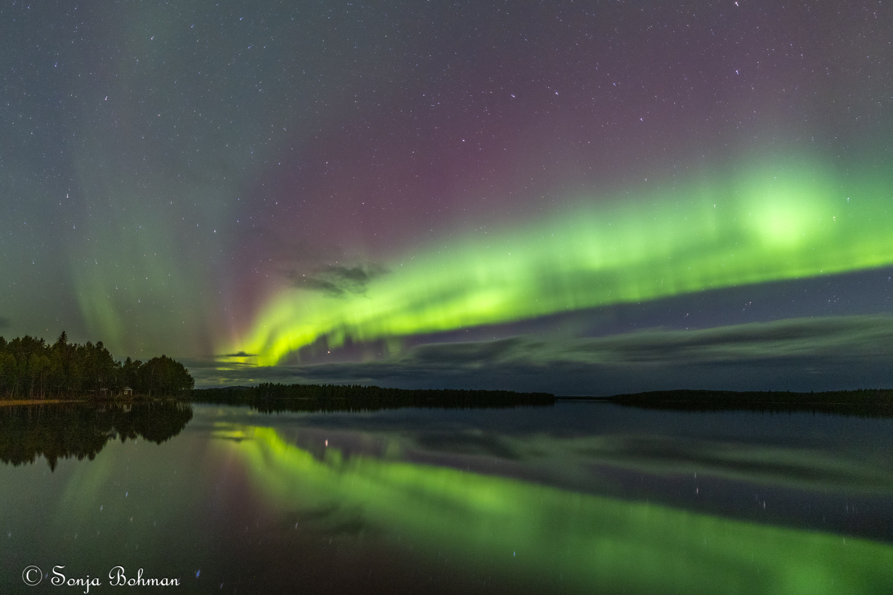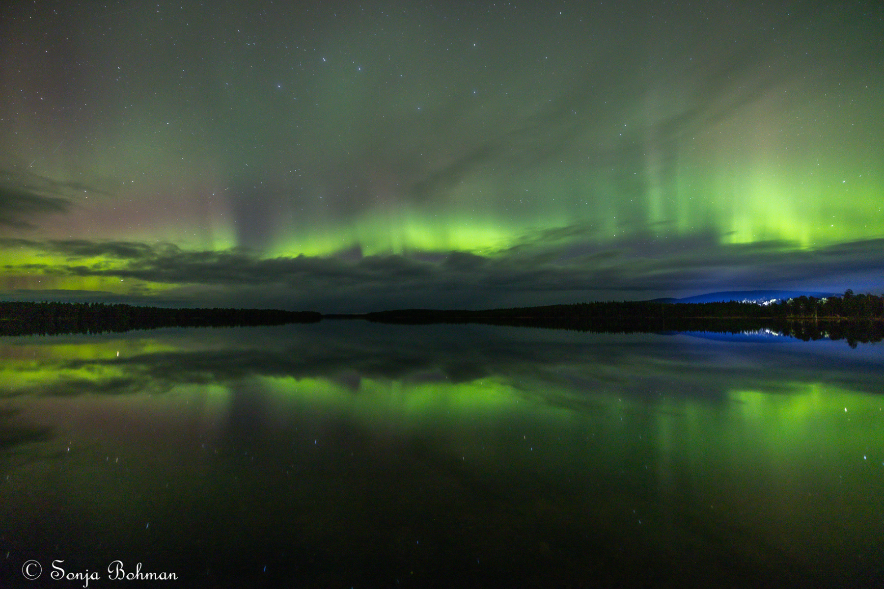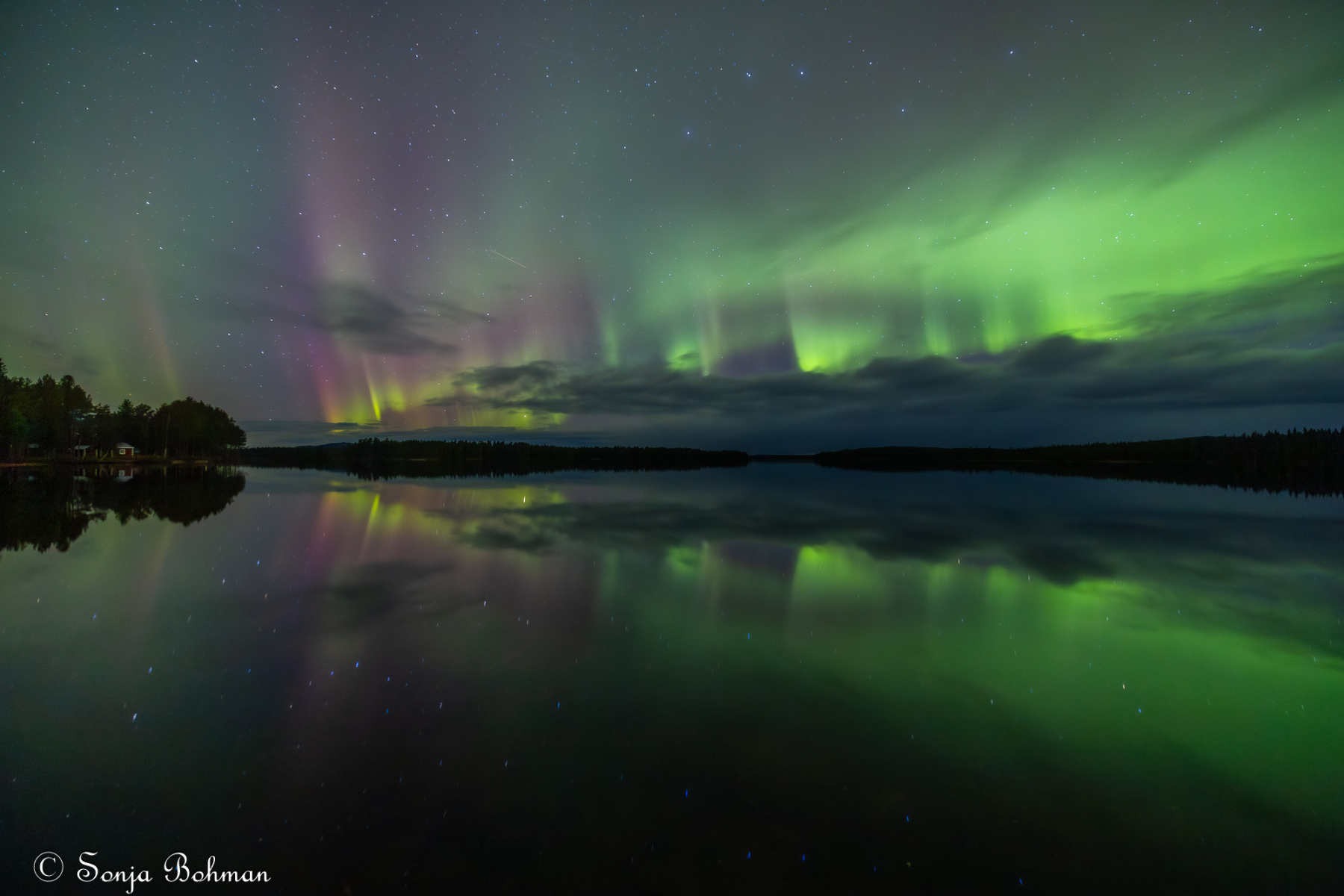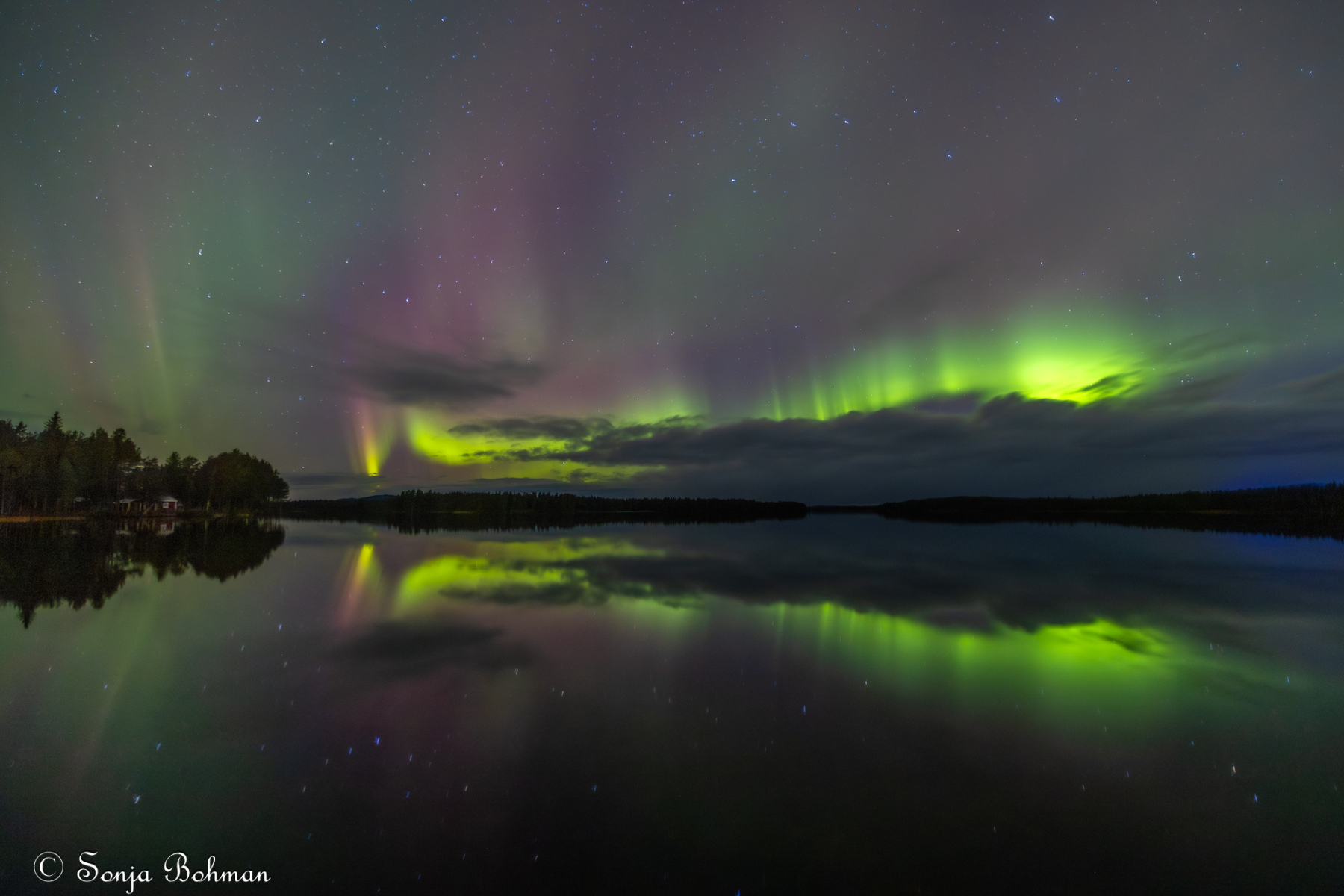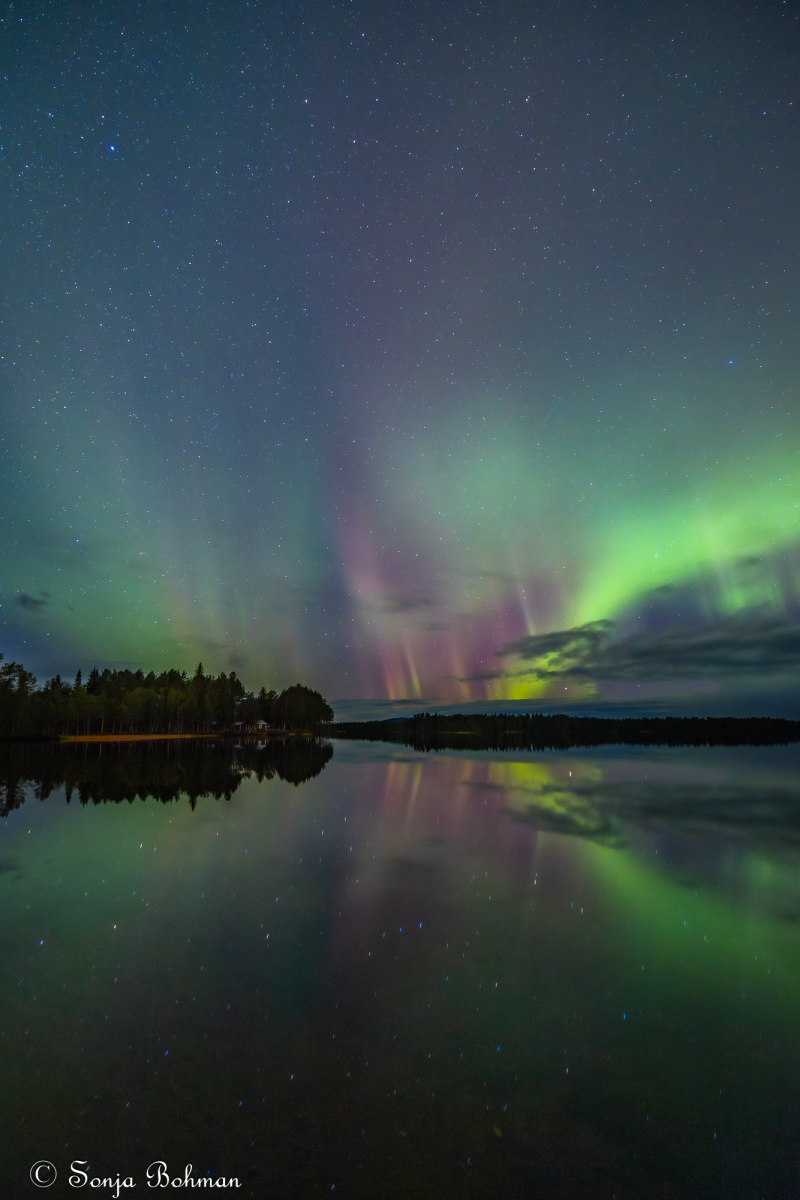 Straxt norr om Arvidsjaur alldeles intill E:45an hittar man en liten camping som drivs av ett energiskt tyskt par. Det är andra gången vi är här, och vi har lyckats pricka in vackert väder bägge gångerna. Också i år fick vi se norrskenet spegla sig vackert i Moskokträsk. Campingen är gammal och sliten och egentligen alldeles för dyr för vad den har att erbjuda, men det är ändå ett bra ställe att fota norrsken på. Campingvärdarna har förstått att vi gäster vill ha så mörkt som möjligt kring husbilarna, och har gått oss till mötes genom att sätta upp svaga röda lampor vid servicehusen, vilket minimerar ljusförorening. Hatten av, säger jag bara.