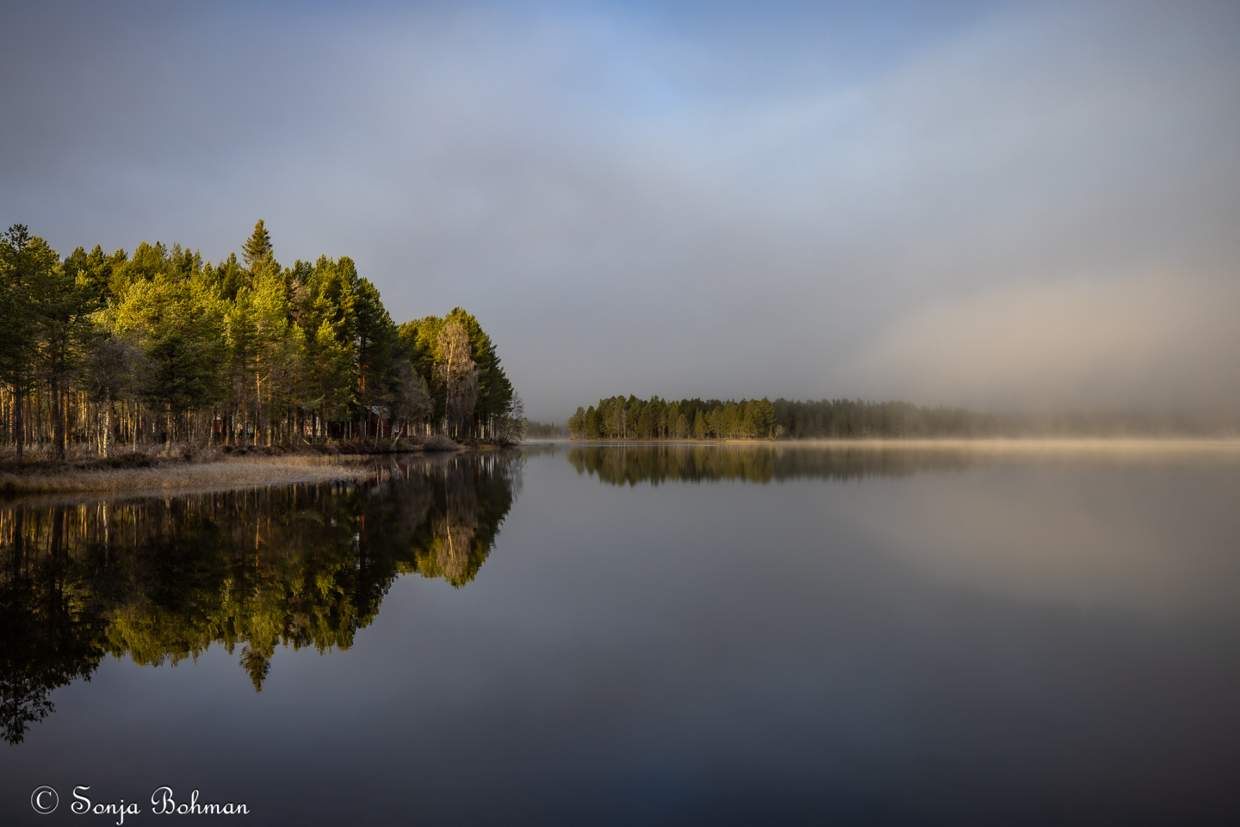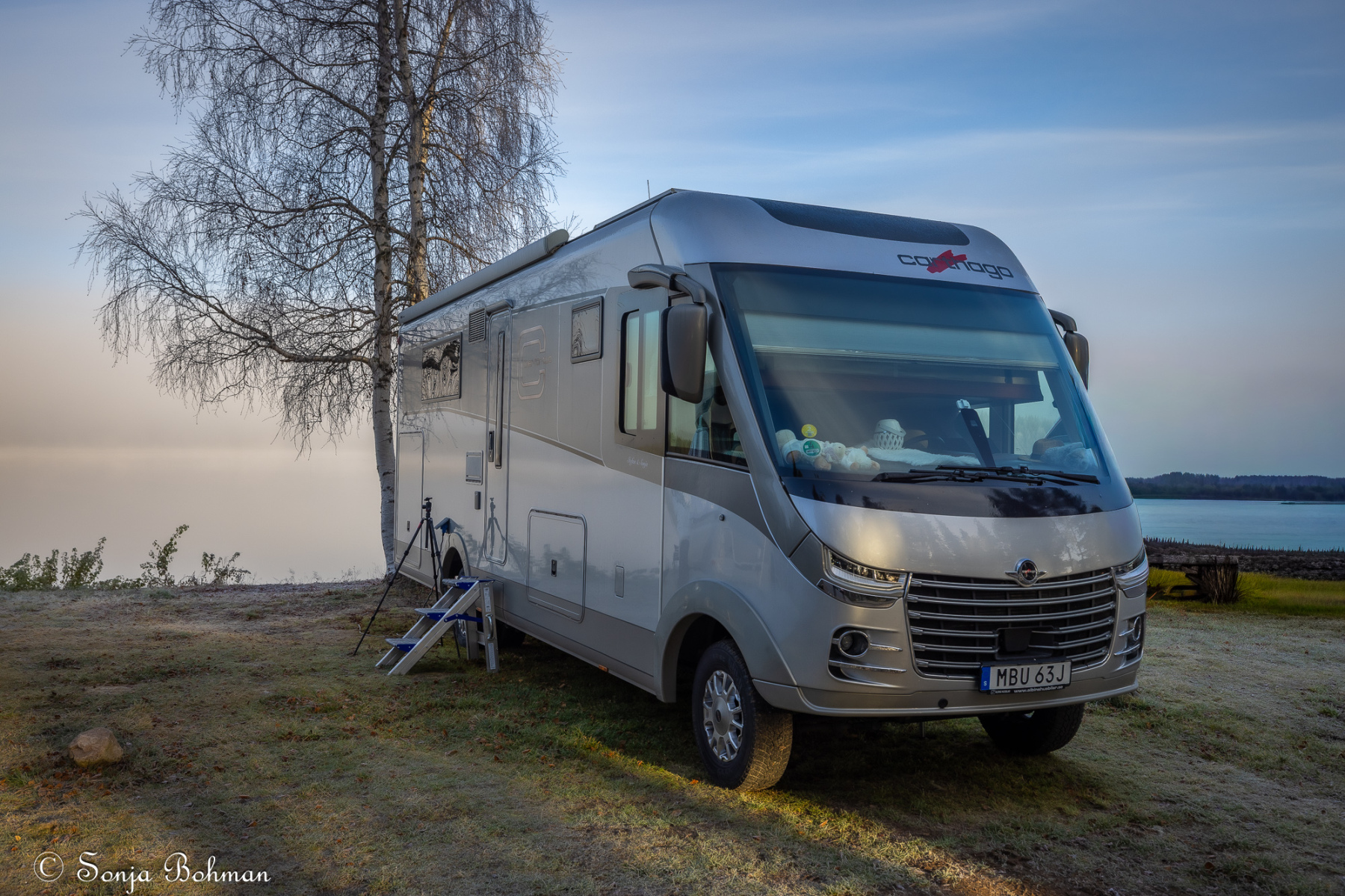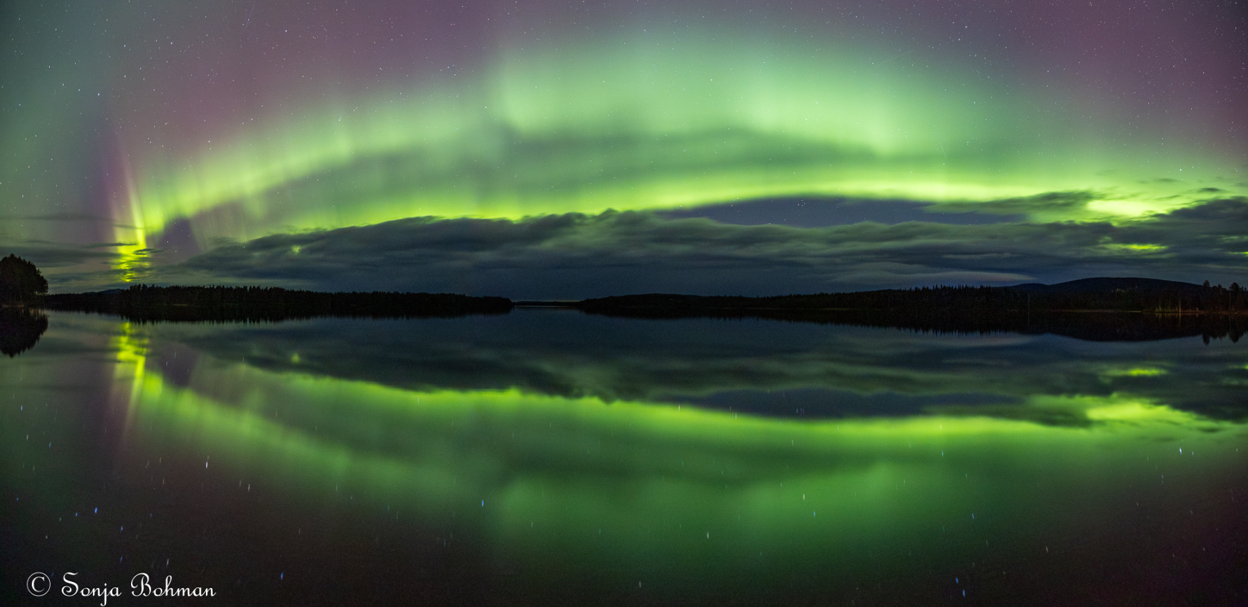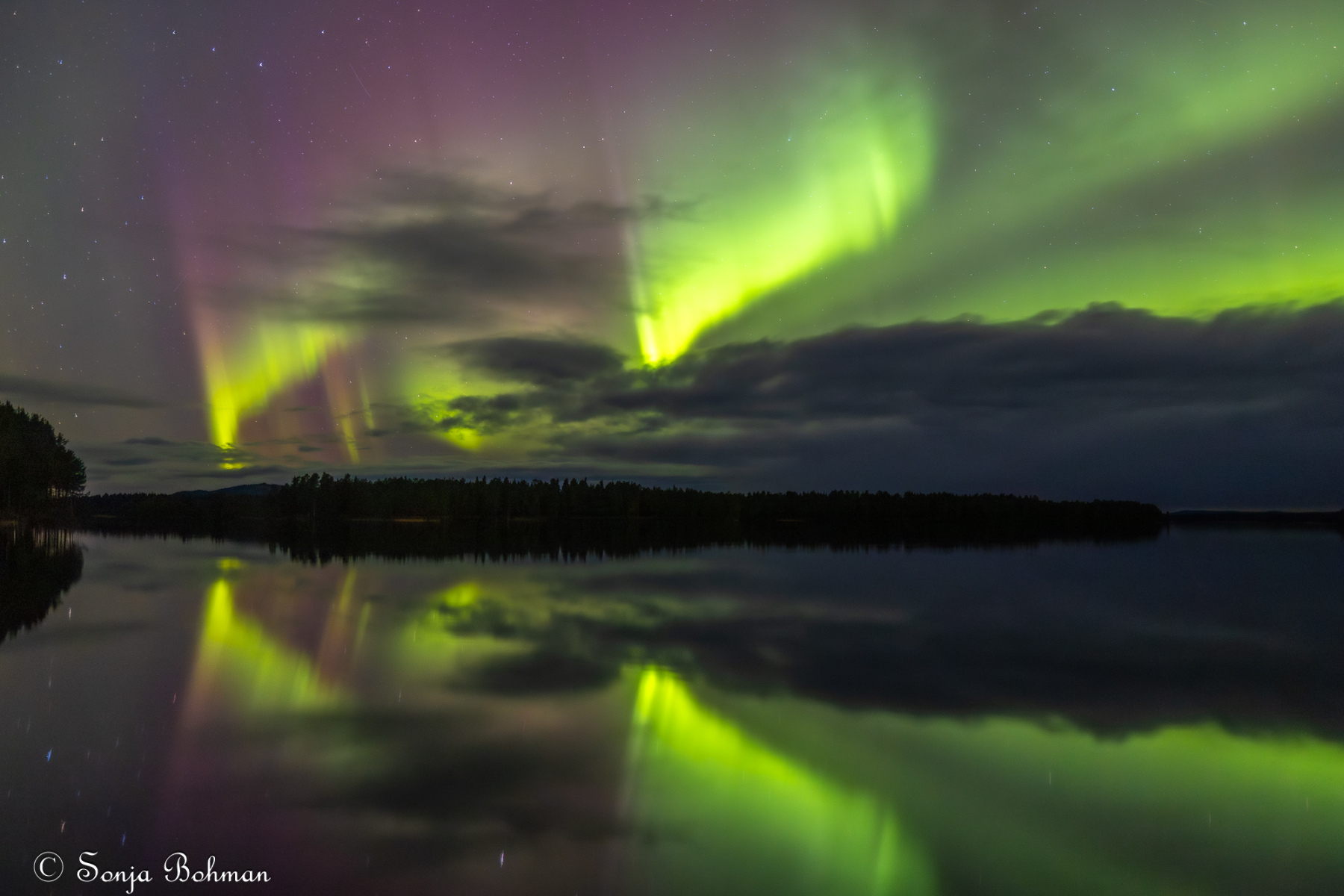Straxt norr om Arvidsjaur alldeles intill E:45an hittar man en liten camping som drivs av ett energiskt tyskt par. Det är andra gången vi är här, och vi har lyckats pricka in vackert väder bägge gångerna. Också i år fick vi se norrskenet spegla sig vackert i Moskokträsk. Campingen är gammal och sliten och egentligen alldeles för dyr för vad den har att erbjuda, men det är ändå ett bra ställe att fota norrsken på. Campingvärdarna har förstått att vi gäster vill ha så mörkt som möjligt kring husbilarna, och har gått oss till mötes genom att sätta upp svaga röda lampor vid servicehusen, vilket minimerar ljusförorening. Hatten av, säger jag bara.
